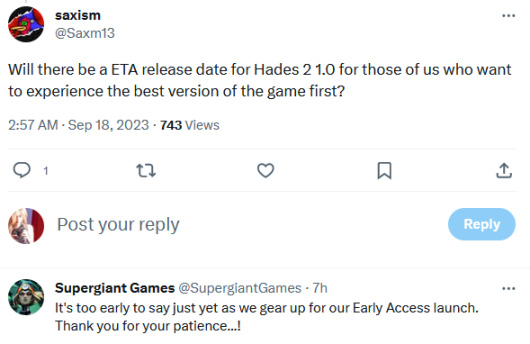 至于《哈迪斯2》,计划于2024年第二季度推出抢先体验版。有网友向官方询问了《哈迪斯2》正式版的发布时间,但官方回应称目前还为时尚早,正式版发布日期尚未确定。