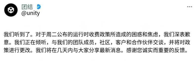 Unity 发文表示,他们已经听到了大家的声音,对于更改收费策略而引起的混乱与焦虑深表歉意。目前正在与团队、社区、客户以及合作伙伴进行沟通,并将对策略进行修改,具体更新会在几天内公布。