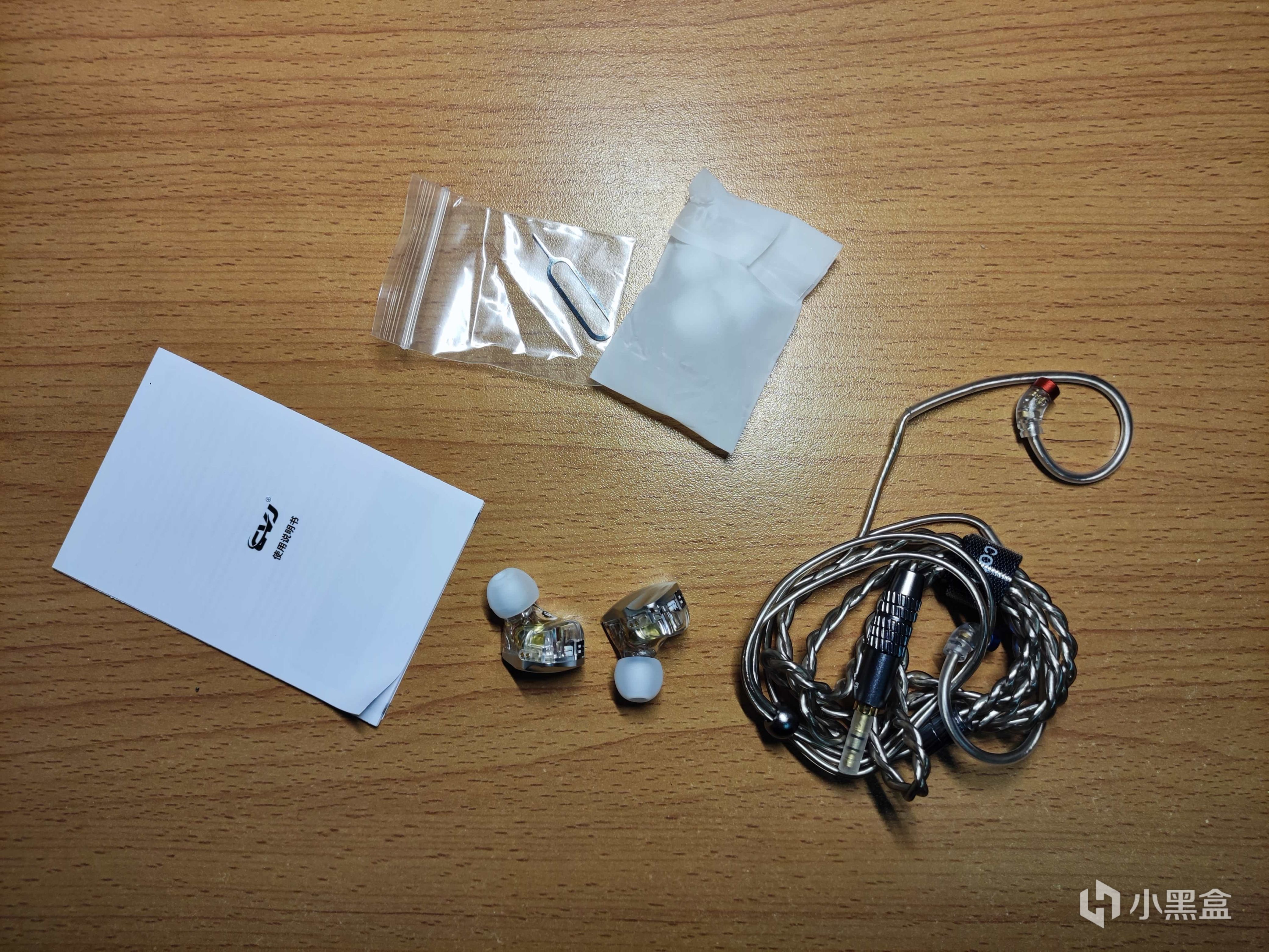 全家福:一根3.5mm插头的耳机线,三对耳塞、一个插针、一本说明书。