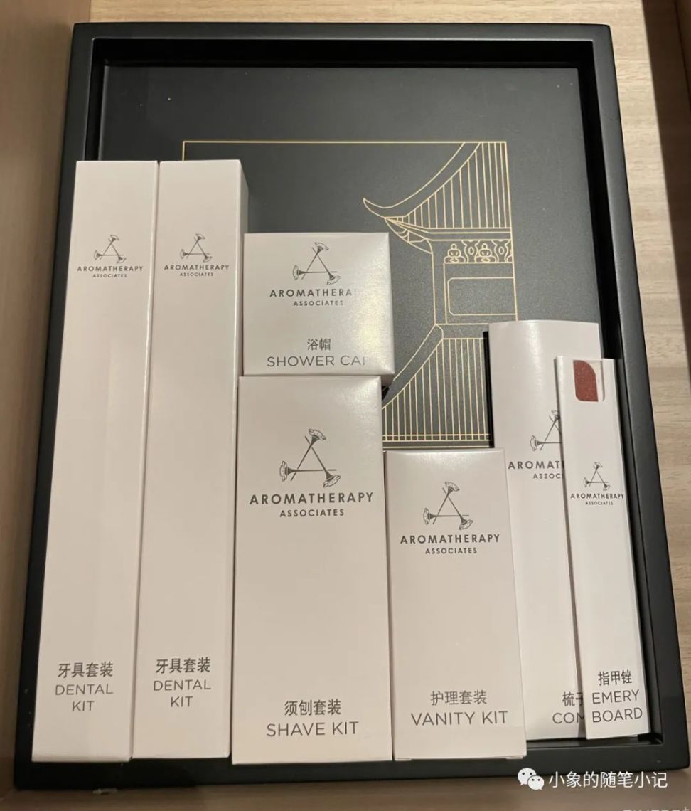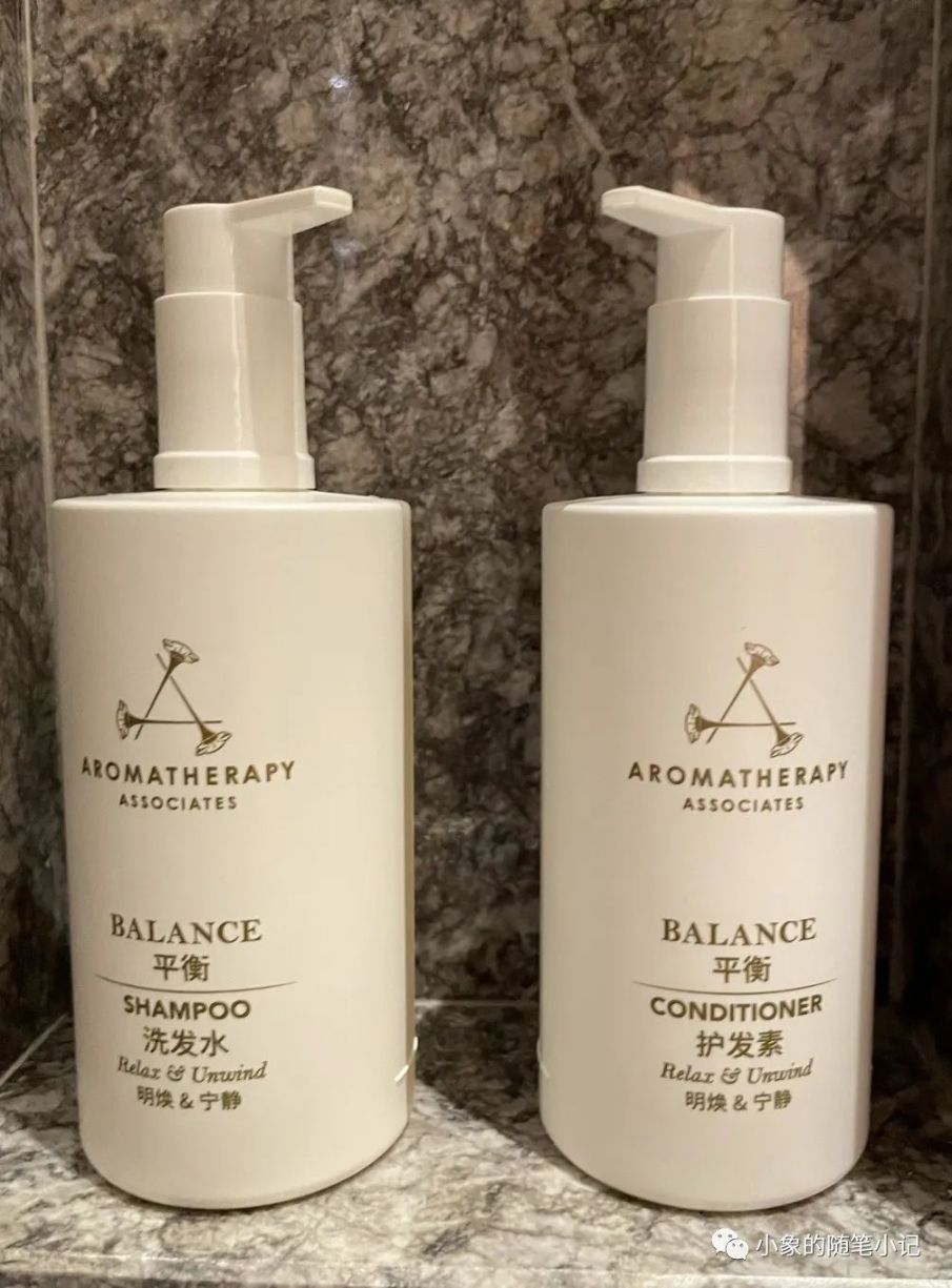酒店的备品很全,提前注明了要额外一份所以导致房间里有三套完整的备品——Aromatherapy Associates,很不错。身体乳的味道有点奇怪,看成分可能是甜扁桃油的味道……另外是300ml大瓶,没有羊毛可以薅。酒店给的理由是减少包装,为了环保!(很正确啊)