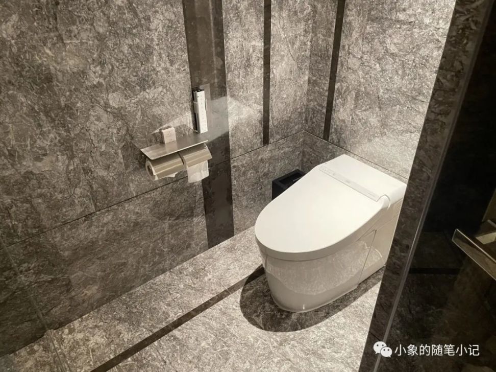接下来看看卫生间,双台盆的设计与独立浴缸中间夹着一个极大的盥洗室空间,淋浴间是做的黑色玻璃小隔间,自动感应的智能马桶也都符合现代开业的新生酒店配置。