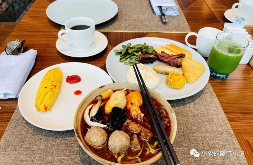 另外说说早饭!因为赶时间所以没有在入住的当天去吃,但是后面又囤了一张早餐券,原价128一位的早餐我定了98,所以另外择日去吃了。早餐和大堂在同一楼层,总体而言丰富度尚可,味道也相当不错,符合品牌定位。