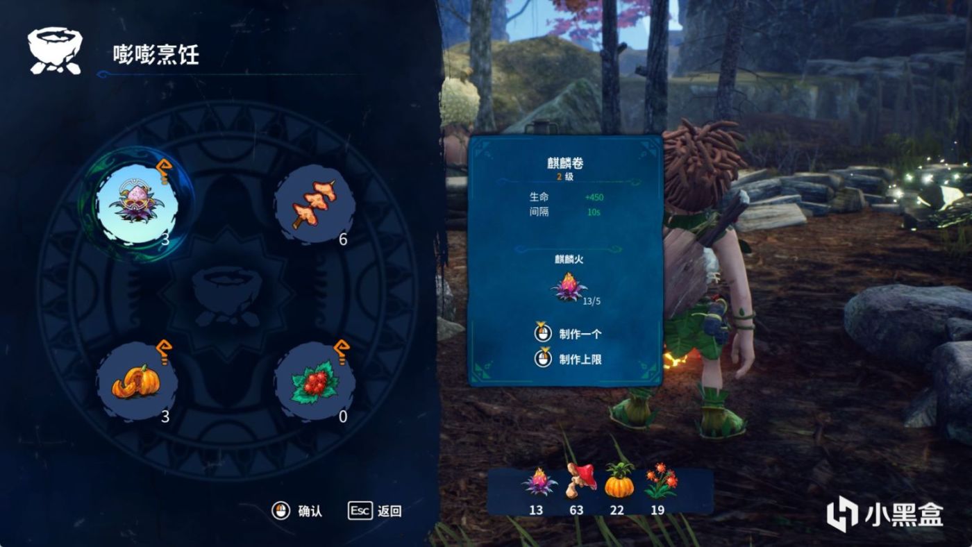 在探索过程中主角卡库需要随时随地收集资源以制作对应的道具应对危机四伏的大陆,游戏中以食物的方式取代常规的药品,玩家可以通过烹饪制作一共四种食物,可简单理解为蓝药红药,以及两个buff药品,虽然种类很少,但是我觉得确实恰到好处的,因为四种食物就已经可以满足玩家的基本需求了,而且最重要的是食物的材料随处可见,这也大大降低了玩家入门的门槛,