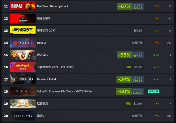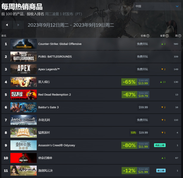 从国区来看,《双人成行》凭借新史低的价格排名第一,《荒野大镖客 2》《博德之门 3》分别位列第二第三,刚刚发售的《猛兽派对》《逸剑风云决》也进入前十。