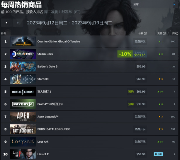 IT之家 9 月 19 日消息,Steam 商店官方今日公布了 2023 年 9 月 12 日到 9 月 19 日的热销游戏,排除免费游戏和 Steam Deck 掌机后,《博德之门 3》再次成为第一,《星空》仅登顶两周就被挤到了第二。