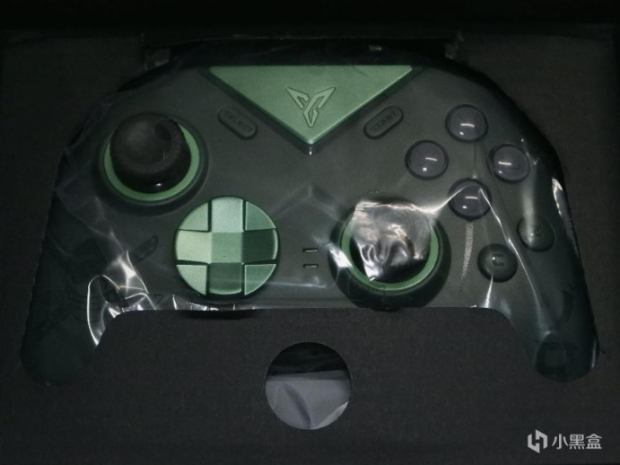 打开包装盒则是一张写着飞智黑武士3Pro的介绍黑卡,带有飞智老板的印刷签名,质感上比较一般,建议下次整加厚版本的铜版纸用于印刷。将卡片移开,就可以看见我们的主角了——飞智黑武士3Pro索隆版(以下称为3Pro),其本身的颜色和索隆本身的颜色色系还是比较搭的,整体为墨绿色,与索隆的衣服相互照应,而正上方带有LOGO的颜色较浅的绿色部分,则与索大的头发发色相互照应,可以说这波联名还是不错的,总比某厂只是换了个包装盒要用心的多。