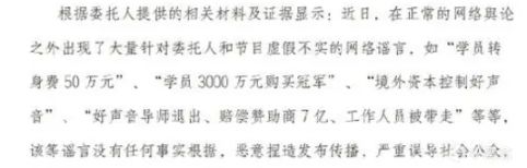 9月初,好聲音製作組起訴大量網友,對於網傳的諸如“學員轉身費50萬元”、“學員3000萬元購買冠軍”、“境外資本控制好聲音”、“好聲音導師退出”、“賠償贊助商7億”、“工作人員被帶走”等言論提起訴訟。
