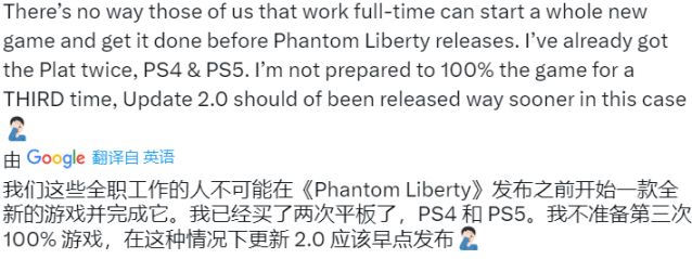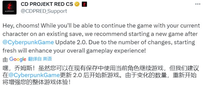 Cyberpunk 2077在今日回覆玩家建議在2.0《往日之影》更新以後,重新開始新遊戲,這樣可以增強遊戲的整體體驗。