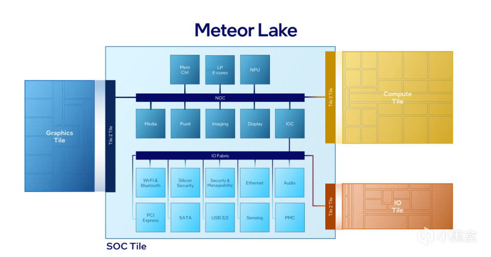 Meteor Lake的第一個改變,就是利用Foveros封裝技術縮短這4個Tile的距離,使其獲得更高的內部帶寬。同時SOC內部的IP由NOC總線進行連接。NOC總線特性是高帶寬、快響應,並允許掛靠在上面的所有IP快速、低功耗的訪問整個內存,包括Foveros封裝連接的計算Tile和圖形 Tile,也包括內部的E-Core、內存控制器、多媒體IP、NPU、IPU等等。