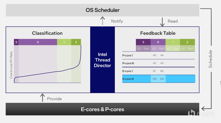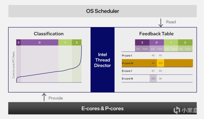 重點在於不同任務負載是如何在不同核心之間進行切換的,這裏就需要引入英特爾硬件線程調度器(Intel Thread Director,ITD)了。這裏的ITD介於CPU硬件和Windows系統的中間層,用來反饋P-Core、E-Core和LP E-Core的實時運算能力,爲系統調配提供一個推薦。