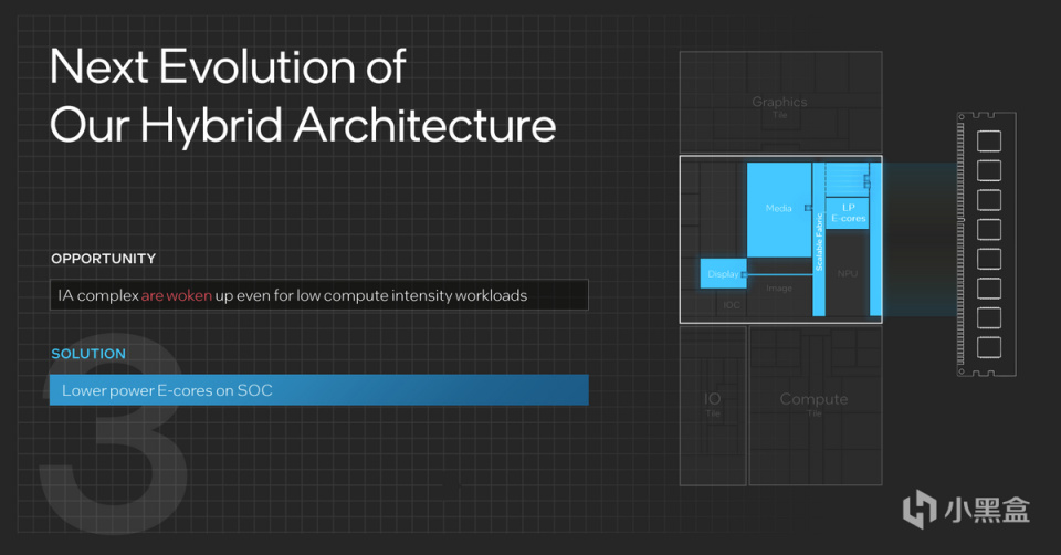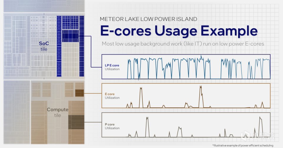 但需要注意的是,IP的操作仍然需要計算單元的控制和協調,如果爲了流媒體播放而啓動Core部分的P-Core和E-Core,那就有本末倒置了。爲此,英特爾特意在SOC Tile中引入了一個超低能耗的效能核,稱爲LP E-Core。
