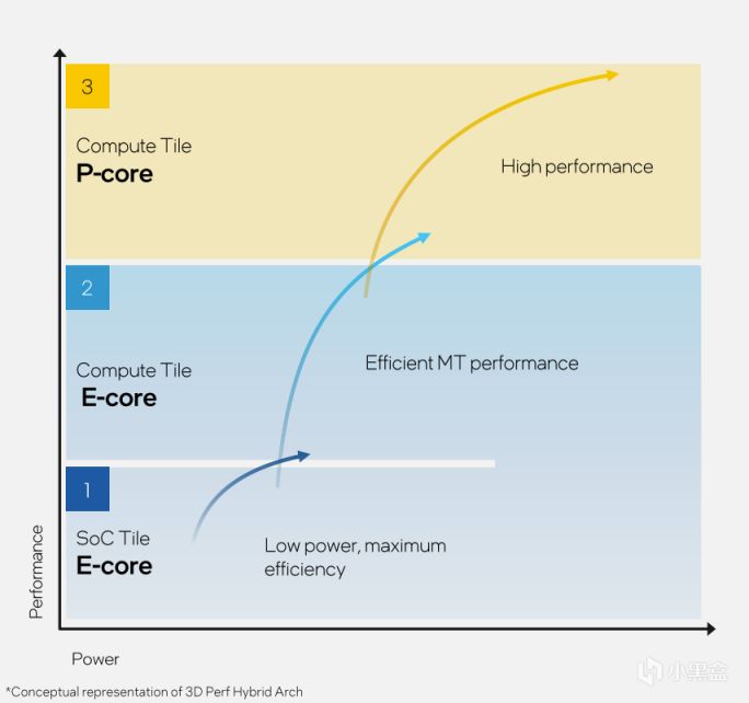 由於SOC Tile中包含了額外的LP E-Core,在實際計算中,包含了三階混合計算模式,即計算Tile中的P-Core和E-Core,以及SOC Tile中的LP E-Core,他們在能耗和性能上都會有不同的分配方式。