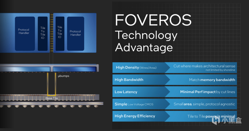 可以看到,SOC Tile在收納各種IP的同時,實際上也承擔了一定程度基板的功能,實現了與計算Tile,圖形 Tile,IO Tile三個模塊的高速連接,由於彼此並非完全的堆疊關係,所以英特爾將其成爲2.5D和3D封裝的融合設計。