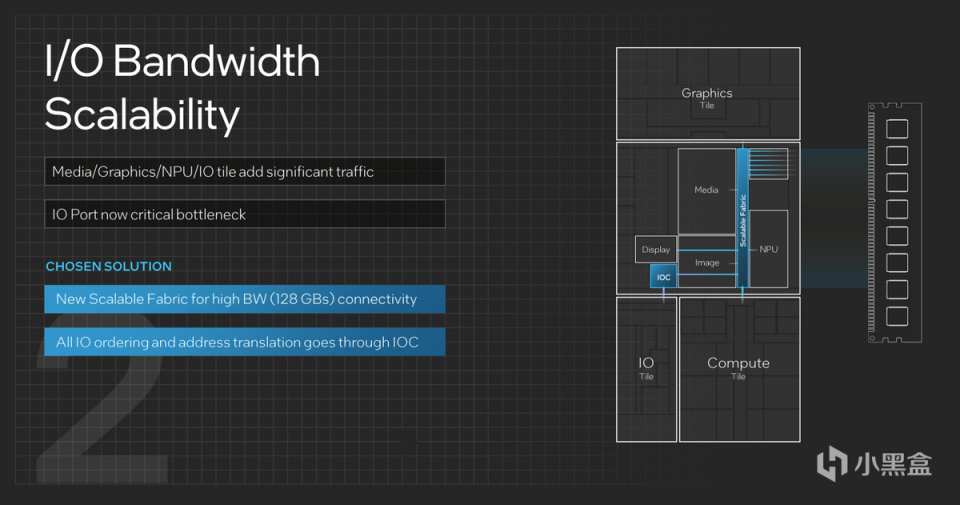 但Meteor Lake使用了全新的SOC帶寬擴展方式,使得所有IP的帶寬分配是實時匹配的,消除了IP與IP之間,IP與Ring總線之間,IP與I/O之間的溝通瓶頸。不僅如此,英特爾還添加了一個I/O的緩存模塊來管理I/O量和地址轉換,確保執行次序可以被更好的進行。
