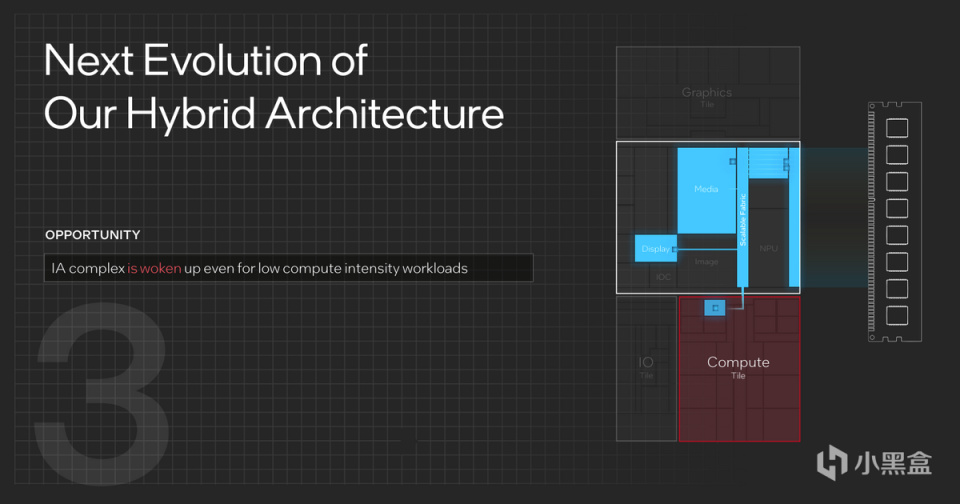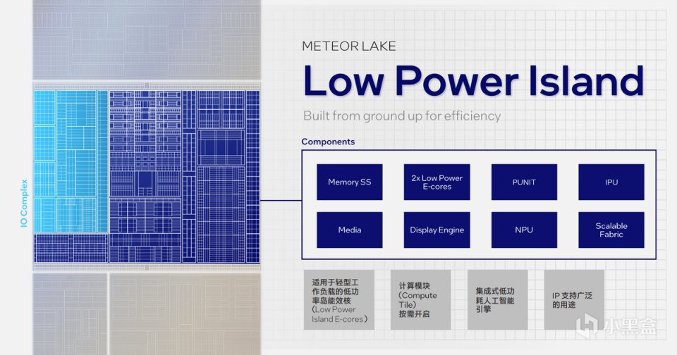 與此同時,Meteor Lake引入低功耗島(Low Power Island)的設計,它的特點是適用於輕型工作負載,調配計算Tile按需開啓,並集成低功耗人工智能引擎,以及IP的調配和擴展。如果工作負載需求不高,低功耗島就可以解決日常的工作問題,包括PC的睡眠、超低功耗模式等等,只有在負載提升之後,低功耗島纔會進一步調用其他IP和Tile,全速運行。