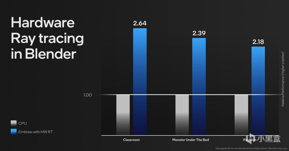 新的核顯光線追蹤能在遊戲、生產力、科學研究擁有不錯的表現,以Blender爲例,可以獲得相對CPU兩倍以上的性能提升。
