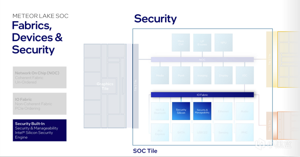 可以看到SOC Tile內部還擁有一個IO fabric總線用於連接I/O Tile,以及SOC內部的音頻、有線與無線連接網絡等IP,其中還包括2個安全模塊,分別是新增加的芯片級SSE,另外一個是用於提升可靠性的CSME。