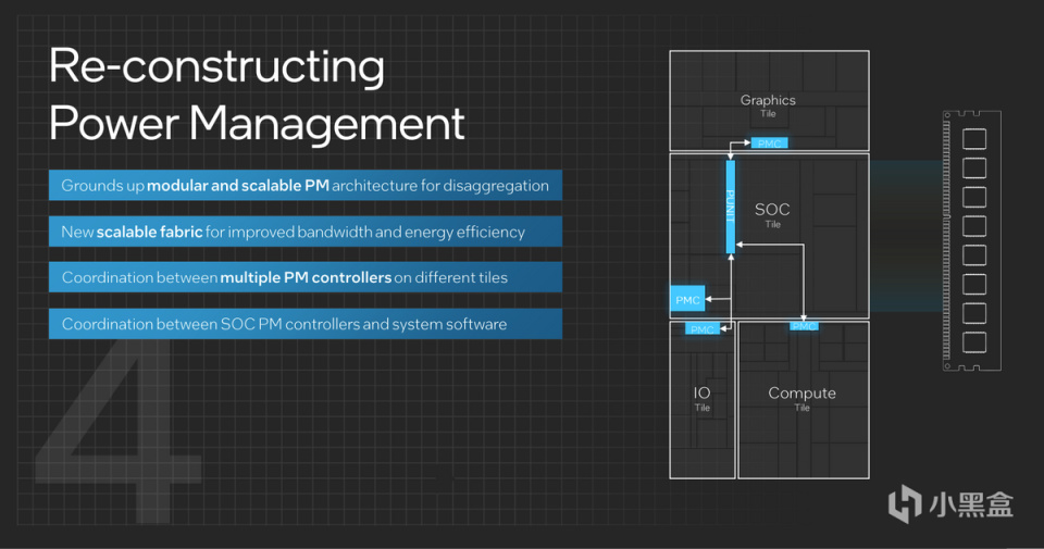 在技術分享會中,英特爾多次強調了Meteor Lake以及SOC Tile高效能、低功耗的特性,那麼他們是如何做到的呢?重點便在於每個Tile上都有專屬的電源管理模塊,並且相互之間都互相協同電源管理工作,包括上層炒作系統、軟件協同,從而實現系統級別的完整電源管理。