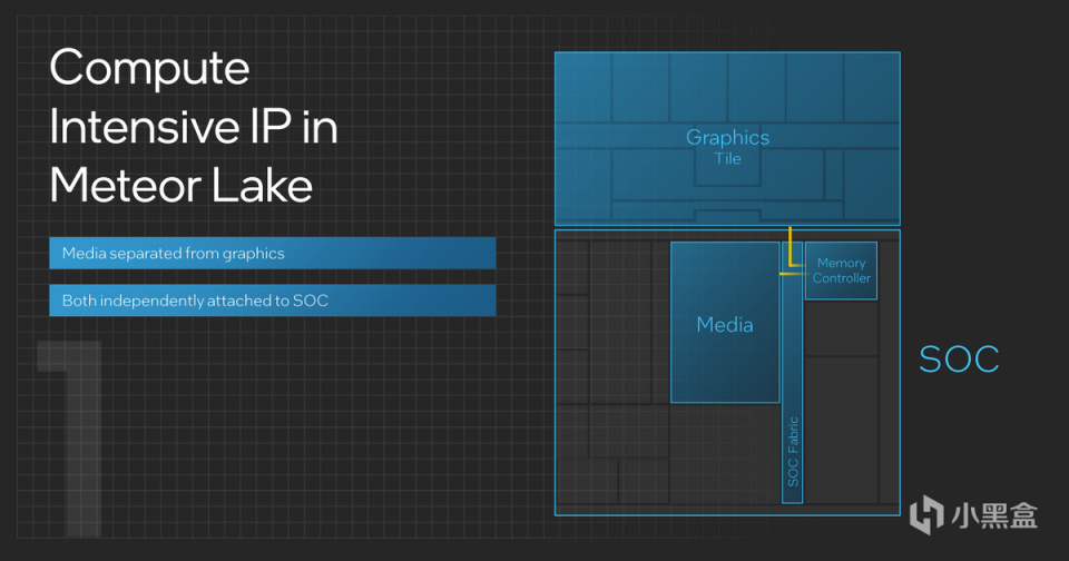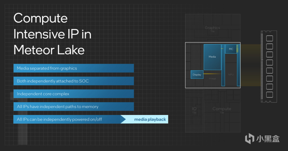 因此Meteor Lake首次將媒體部分和圖形拆分,從Ring結構中移除,放進單獨的SOC Tile中,不僅便於生產,有更好的經濟性,在實際使用的過程中也更爲省電。這時候如果執行不同的任務,只需要調用對應的模塊就可以了,其他部分可以不參與工作。