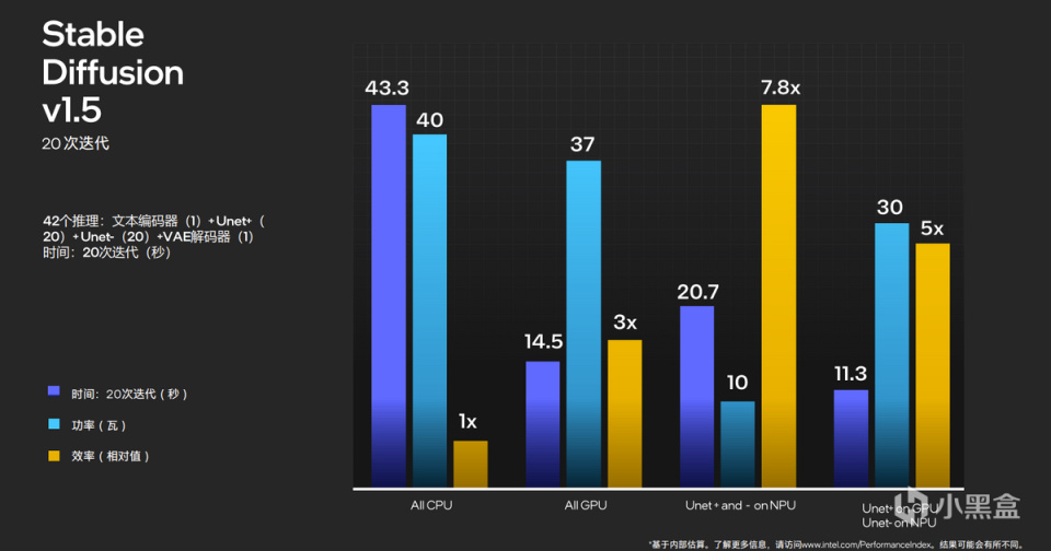 如果让Unet进行20次迭代,整个过程中只依靠CPU,功耗将达到40W,耗时43.3秒。如果将工作全部交给GPU,效率将提升3倍。但其实在英特尔XPU生态中,CPU、GPU和NPU可以同时调用,如果让NPU和GPU承担一部分的Unet工作,不仅效率提升明显,并且功耗还可以进一步降低。