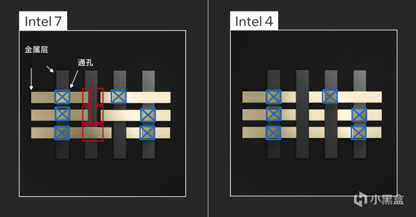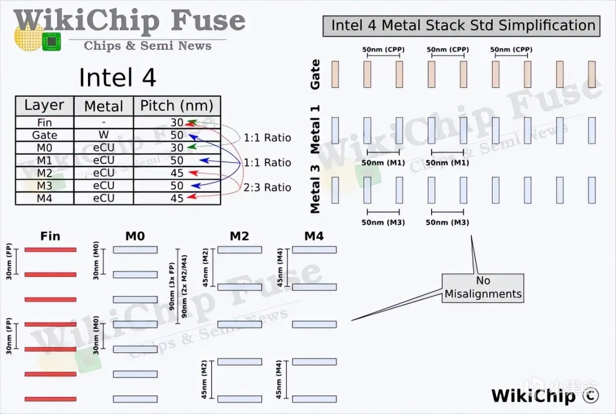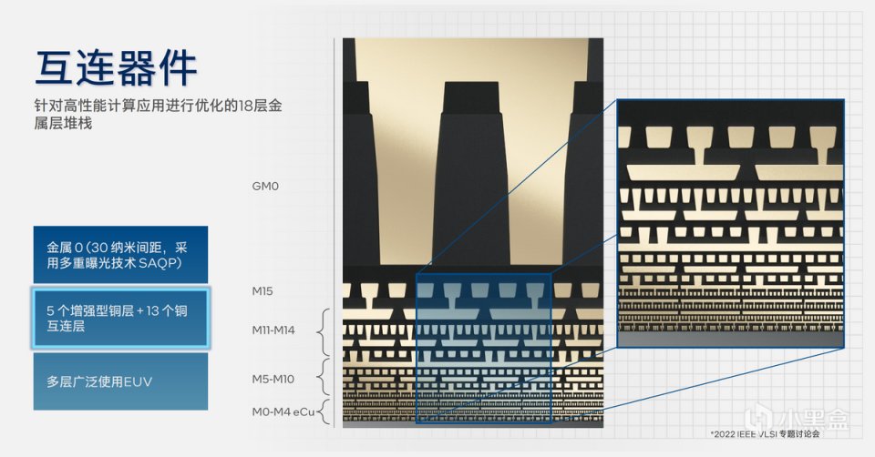 在18层金属层堆栈上,由于多层级EUV技术,英特尔通过四重自动成像工艺,实现了更高的密度,进一步使得30nm金属层间距缩小,也为布线提供了很好的支持。