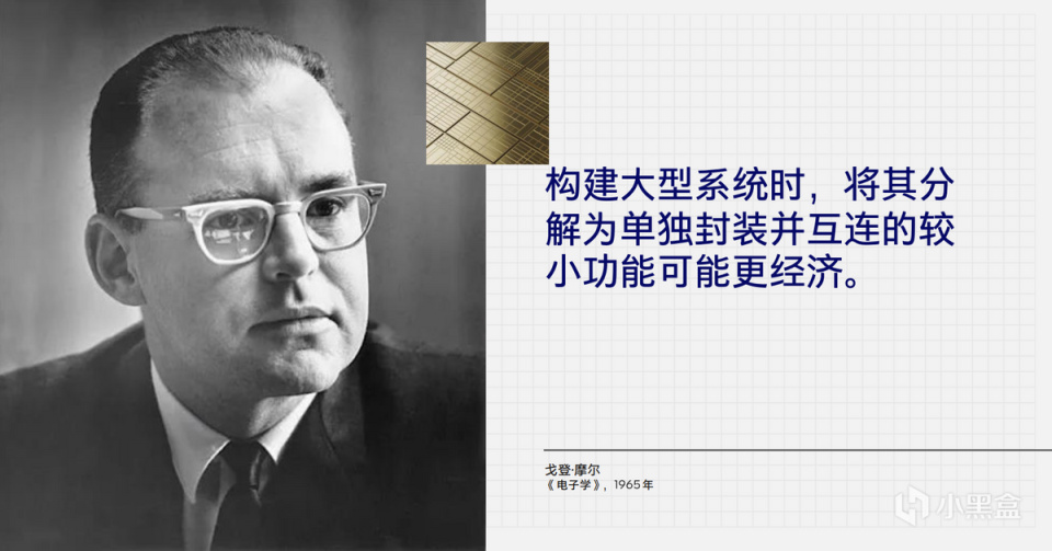 戈登·摩尔曾经表示,在构建大系统时,将其分解为单独封装并互连的较小功能可能更经济。在构建复杂系统时,通过分解成单独封装并提供小型化的互联模块可以带来更好的经济性。
