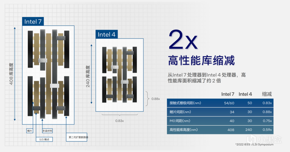 当然,重点是Intel 4制程工艺带来的整体Die集成度变化,以高性能库高度为例,Intel 7的高度可以做到408nm,Intel 4则可以进一步缩减到240nm,缩减了将近0.6倍,也就是40%的尺寸缩减。同时,鳍片间距和M0(金属0)间距均有不同程度缩减。