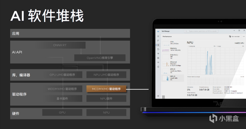 在软件层面NPU符合微软MCDM驱动框架,因此在Windows任务管理器中可以看到NPU的存在,属于计算设备中的一种,可以随时查看NPU的负载情况。