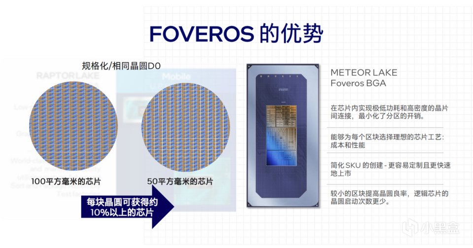 随着小型化互联技术的成熟,多模块、小芯片Chiplet设计开始变得司空见惯,在Meteor Lake上,通过小型化模块连接实现2.5D和3D封装,实现Die与Die之间的高密度连接,无疑可以让产品功耗、成本、性能都占尽优势。