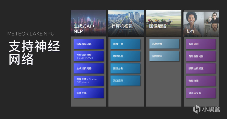 更重要的是,从终端层面看硬件其实已经具备了一定的加速能力,Meteor Lake在做的是将其功耗进一步降低,并让更多人从AI应用加速中获得更好的体验。这个部署实际上从数年前英特尔与合作伙伴的合作中开始,视频增强、美化、背景模糊、超分辨率计算均是AI终端加速的实际案例。随着生成式AI应用的火热,AI的应用场景变得更为丰富,文生图、图生图,文字生成视频都将成为可能,这也给Meteor Lake的NPU提供了用武之地。