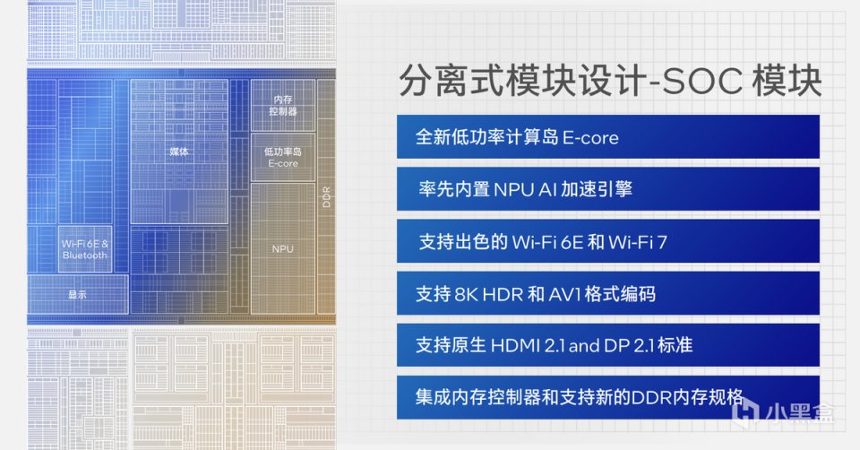 英特尔重新定义SOC模块是将UnCore提升到了一个更重要的级别。实际上在SOC模块中我们依然能够看到很多的熟悉的模块。比如负责无线连接的Wi-Fi 6E & Bluetooth,同时也将会通过外接的形式实现对Wi-Fi 7的支持。再比如原来放在iGPU中的媒体处理计算单元,也就是编解码器硬件,这里包含对AV1格式编码、8K HDR的支持。除此之外,SOC模块还包含输出单元、内存控制器等等。
