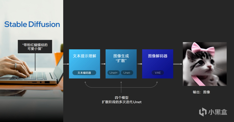 另外一个例子则是时下火热的Stable Diffusion。Stable Diffusion网络结构中主要氛围文本编码器,Unet+、Unet-构成的图像生成,VEE图像解码器,最终才是输出。