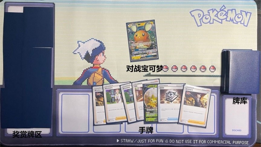 首先先向大家介绍玩家对战区域,在玩家的对战区域上面分别有奖赏区、战斗宝可梦区域、备战宝可梦区域、牌库区域、弃牌区域以及双方共通的竞技场区域。