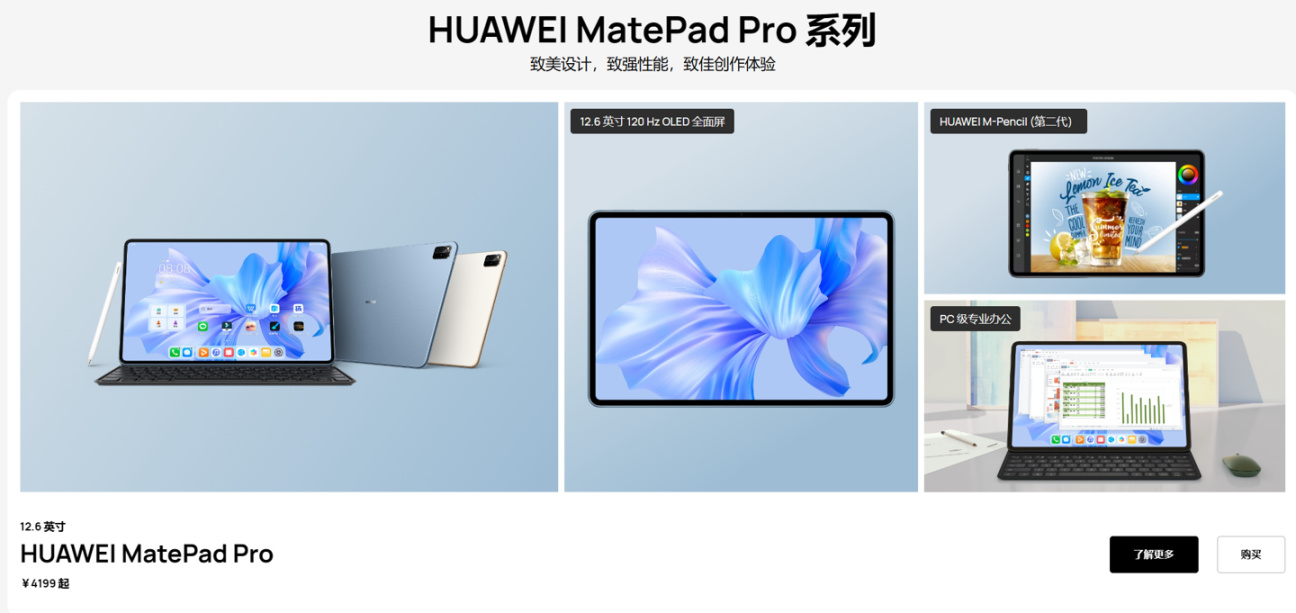 目前華爲官網展示的最大平板是 MatePad Pro 12.6 英寸,搭載麒麟 9000E 處理器,官方標價 4199 元起。新的平板在尺寸上將創新高,售價信息暫時未知,大家可以進行參考。