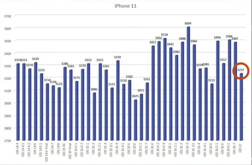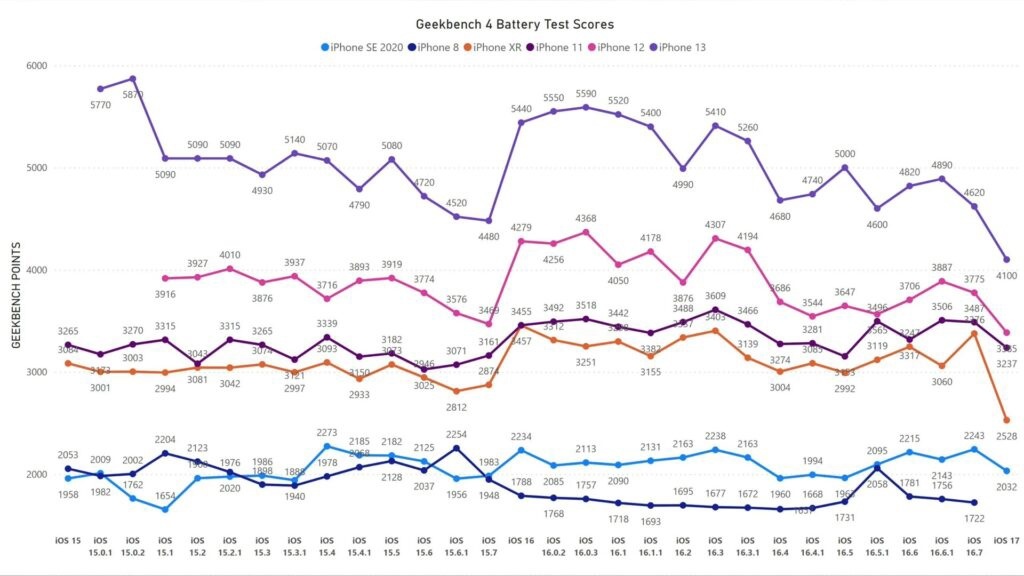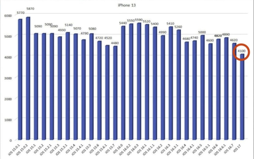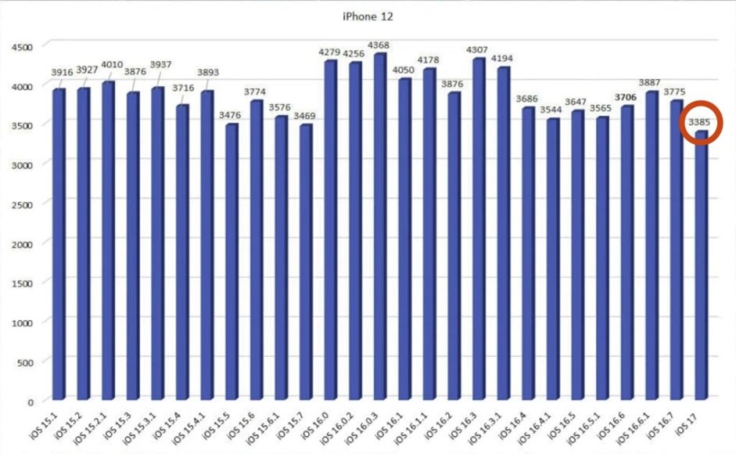苹果今天推送了 iOS 17 正式版,可能有一些小伙伴们担心新系统的续航问题,对此外媒 iAppleBytes 使用 5 款搭载 iOS 17 RC 的旧款苹果iPhone手机,使用 Geekbench 的 Battery Test 进行分析,了解这些手机升级 iOS 17 后的耗电情况。