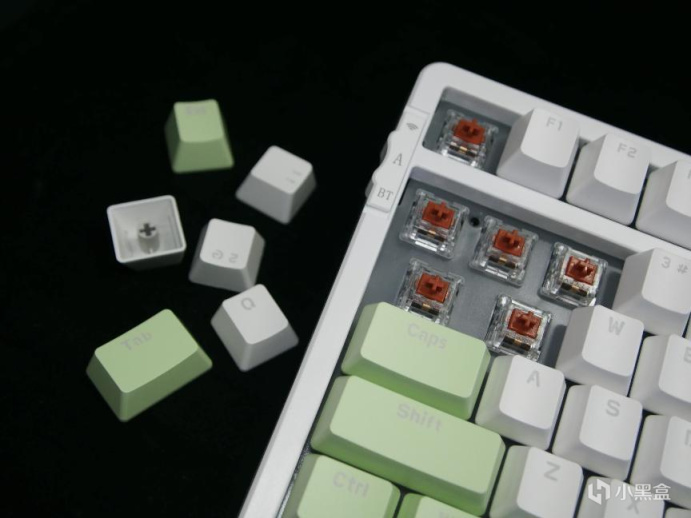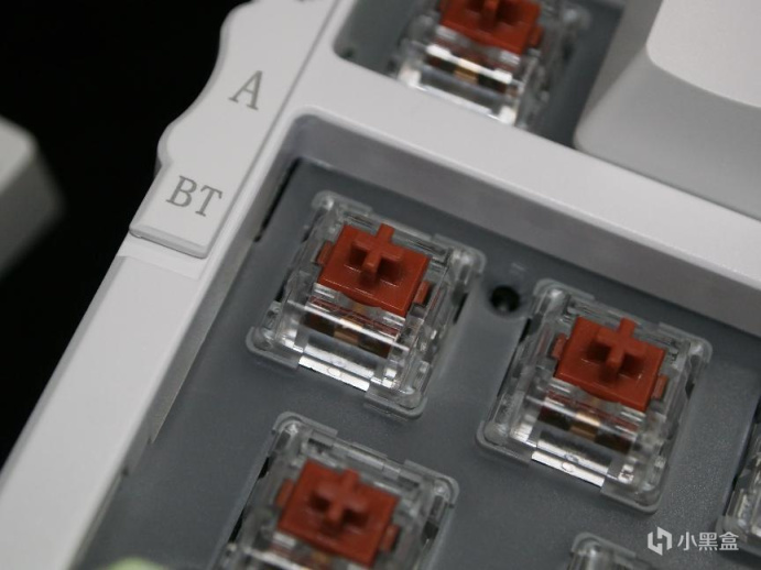 与很多键盘不同,AK992的三模切换是在键盘的左上方而不是背部或者右上方,并且与很多键盘的小推钮不同,AK992的为一个推拉拨片,手指抵在那个小弧度的地方,就可以进行模式切换,实话实说,这个感觉还蛮解压的,同时也可以看见,使用的轴体是黑爵自家的茶轴,键帽则为PBT键帽。