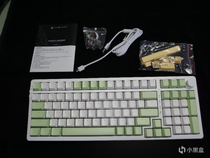 打开包装,取出键盘轴体,我选择这款春日颂主要就是冲着这个颜值去的,草绿色与白色的键帽搭配,看起来还是比较清新安逸的,同时黑爵也在992的包装中带上了一些增补键,不过因为是黄色的按键,与春日我是感觉不是很搭,所以并没有换上,并且还带有几颗替换用的官方茶轴以及拔轴器,用以防止轴体损坏没有轴体更换,一定程度上保证了键盘的一致性,这点还是值得好评的,不过对我这种到手会更换轴体的玩家来说,这到是负了他的一片心意了。自带的线材为普通的C口数据线,并没有采用编织绳工艺,这点有点可惜了,不过这个价格倒也没啥好说的。