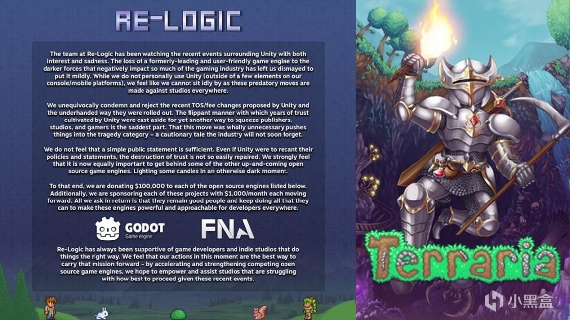 不过Re-Logic仍然提到说,从事件发生以来,他们持续关注整个事件的发展,无法想像曾经对于开发者友好,并领先于业界的游戏引擎,却成为了整个游戏行业的最大恶势力,所以他们觉得自己不能坐视不管这种对于游戏开发者的掠夺行为。