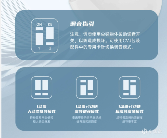 相信有买过CVJ的老哥应该知道,当卡针出现的那一刻,就代表这款耳机可以进行模式切换,浪里也不例外,且本次的三款模式切换十分的极端且明显,例如第一种调音,其其实就是禁用了动铁单元,只保留动圈单元工作,这个时候可以将其当做动圈耳机使用,高素质的动圈表现就出现了,在低音的部分非常不错,用来听摇滚真的很带感,但作为动圈耳机,天生就无法在高频部分有很好的表现,所以这个模式不适合听弦乐器,而第二种模式则是正常的圈铁模式,这个模式下低音由动圈单元完成而高音则由动铁单元完成,整体表现比较好,是我最喜欢也经常用的模式,但毕竟是两个不同的单元,所以在衔接部分略有听感,但不算很大的问题,至于最后这个模式,则为非常极端的极高频高清模式,通过对极高频的增强,使得细节更为丰富,达到了伪全解析的水平,用来尝试是非常酷的事情,且大部分大几百的耳机,所谓的极高解析度也是通过这种方式来实现的,但其本身用来听歌的感觉还是不如第二种来的舒服,当然,这只是个人看法,具体听感见仁见智吧。