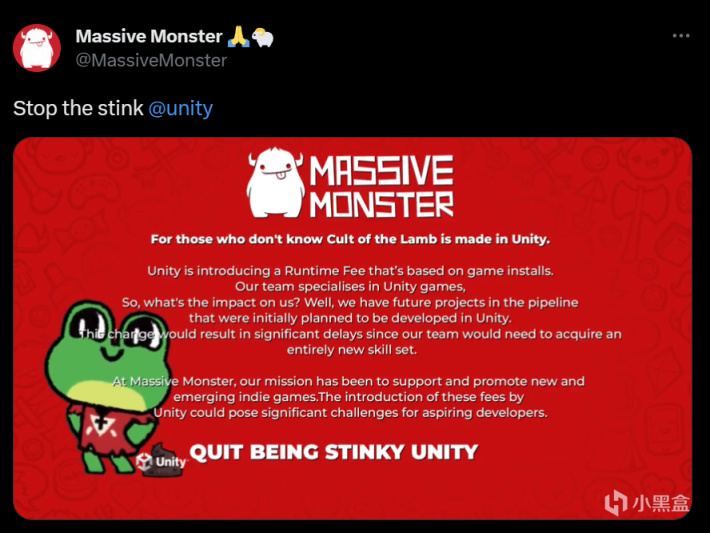 声明刚一公布,此前制作出《咩咩启示录》这一肉鸽游戏的工作室就迅速发布声明,表示自家正在制作一款基于Unity引擎的新游戏,但在看到Unity官方发布的新收费模式之后,他们要推迟这款游戏了,因为需要将游戏整体转移到其他的引擎上面。