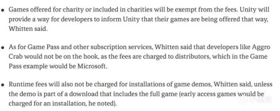 对此Unity还进行了补充说明,其强调如果游戏开发者选择了将游戏加入到XGP阵容当中,那么Unity将会向平台而非开发者收取费用,这意味着其收费目标将会就此变为微软。