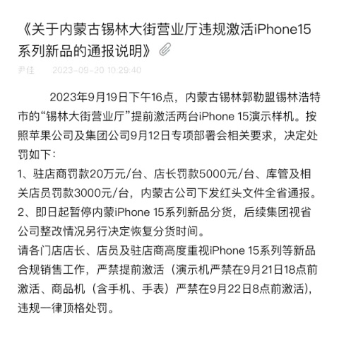 据悉,这是位于内蒙古锡林大街的一家手机营业厅,在9月19日下午4点,违规激活了两台iPhone15演示样机,此前苹果公司发布过公告,禁止演示机在9月21日18点前激活!
