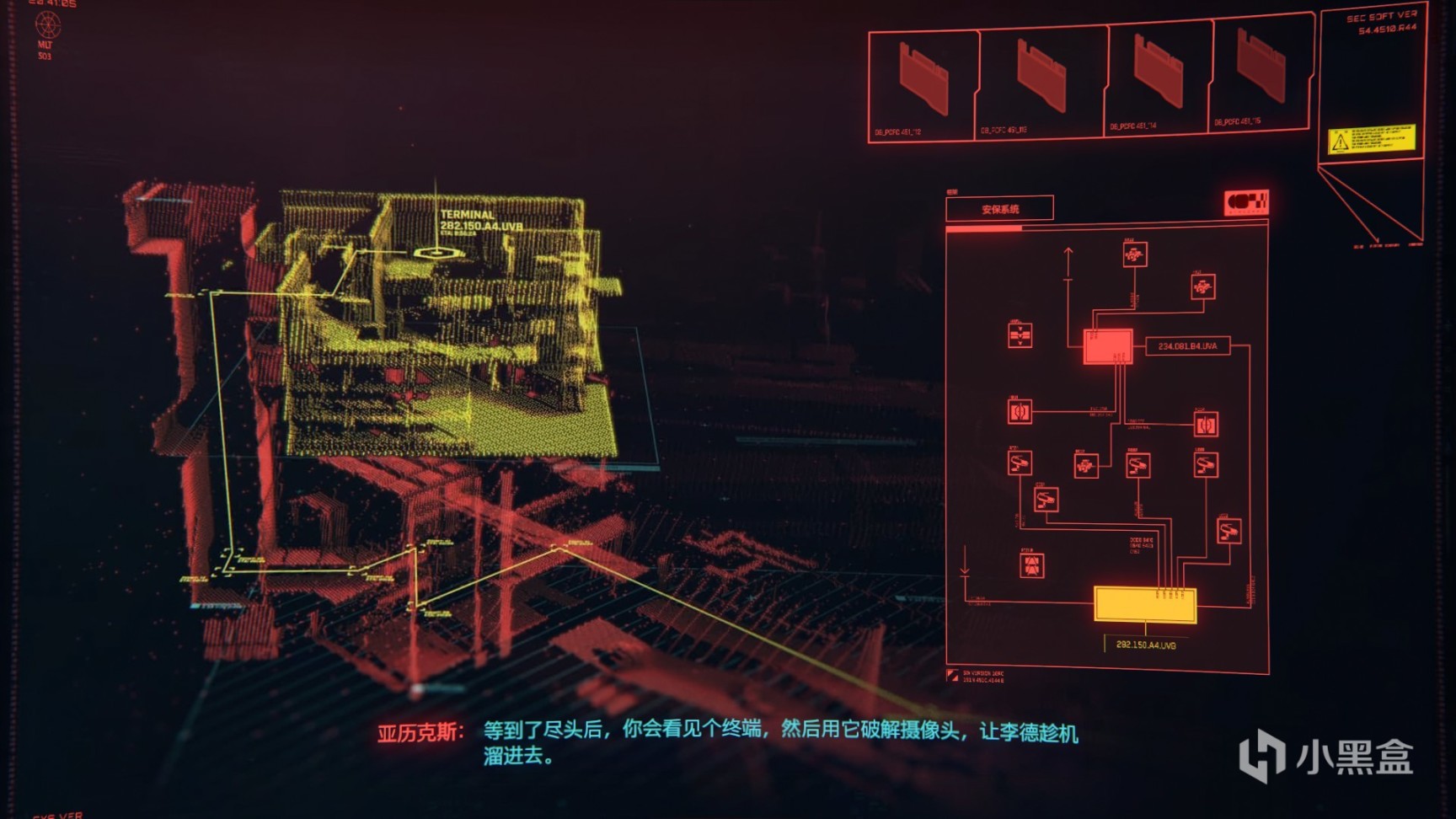除了节奏把控到位的故事剧情,《往日之影》中的关卡同样延续着2077的模式,同一个关卡会有多种不同的过关方式。作为一个头脑简单的手残人士,其实我大部分的关卡都是无脑莽过去的。不过有时候也会尝试用另一种方式达到目的地,例如寻找隐蔽的排风口,或是使用黑客技术,在不惊动双方的情况下达到目的地。