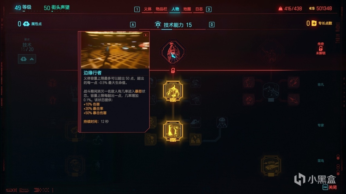 在这些专长中,比较吸引我的是技术能力大类中“边缘行者”专长。根据介绍,这个专长可以支持玩家超出义体容量上限,并且在战斗期间有几率进入暴怒状态,