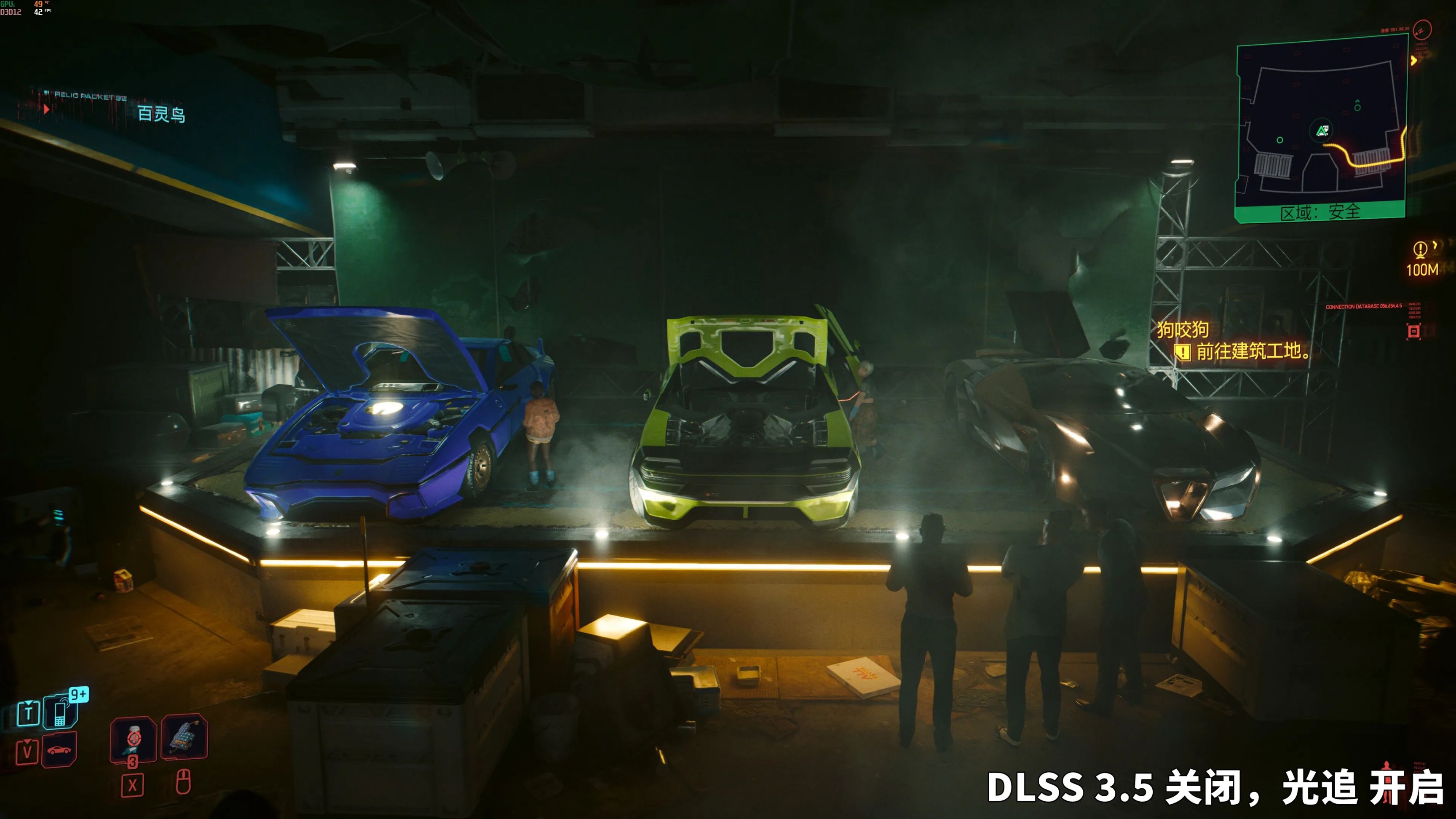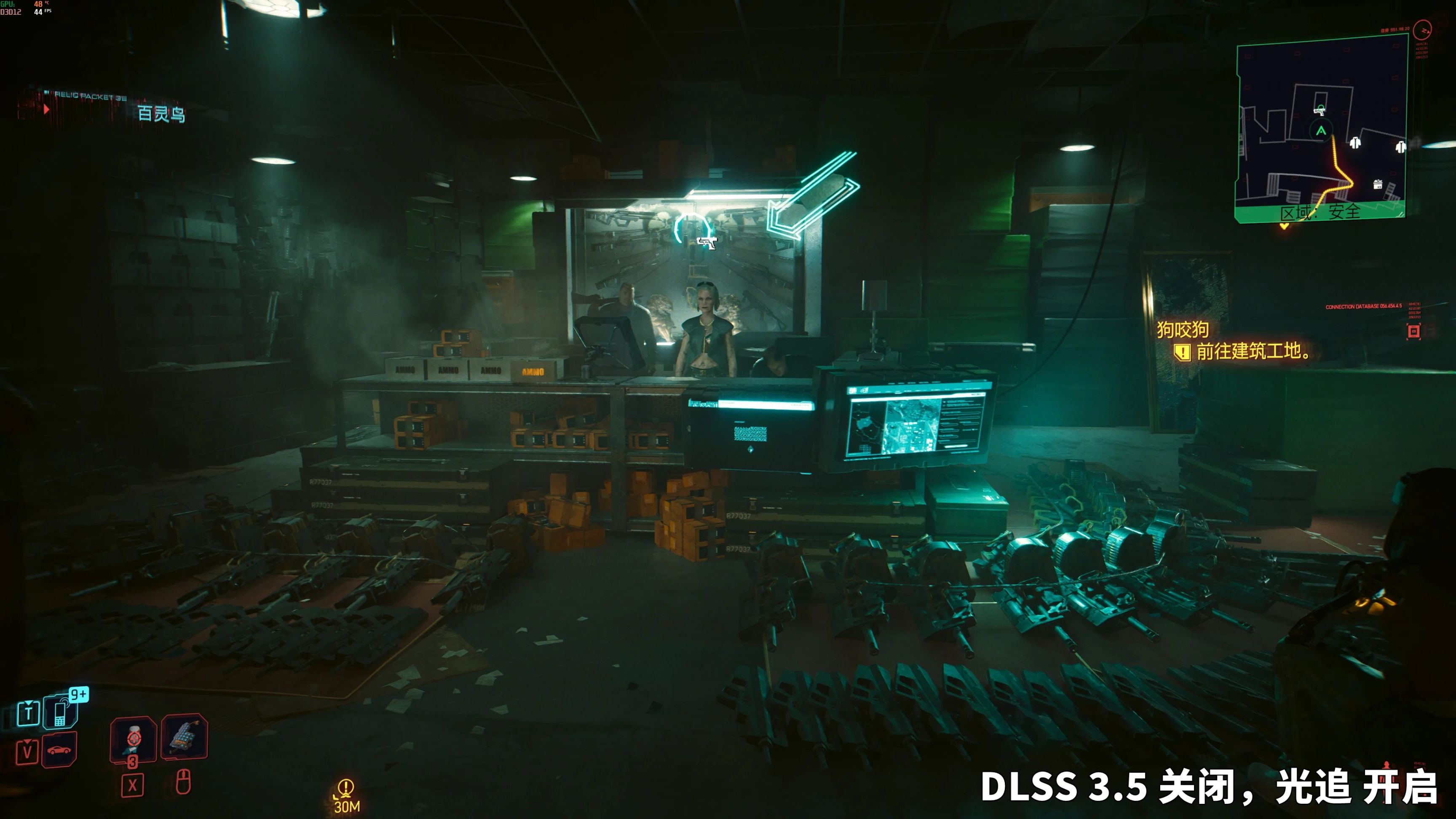 另一方面,光线重建也让游戏画质得以进一步提升。这是一个使用 AI 模型来替代多个人工降噪器的技术,而在游戏中的具体表现就是减少高速动态中的鬼影、准确识别光照范围、让镜面反射内容更加清晰真实 —— 这一点在光线颇为复杂的「夜之城」中体现尤其明显,比如下面这几组 4K 截图,注意左上角的帧数区别(网络图片可能被压缩)。