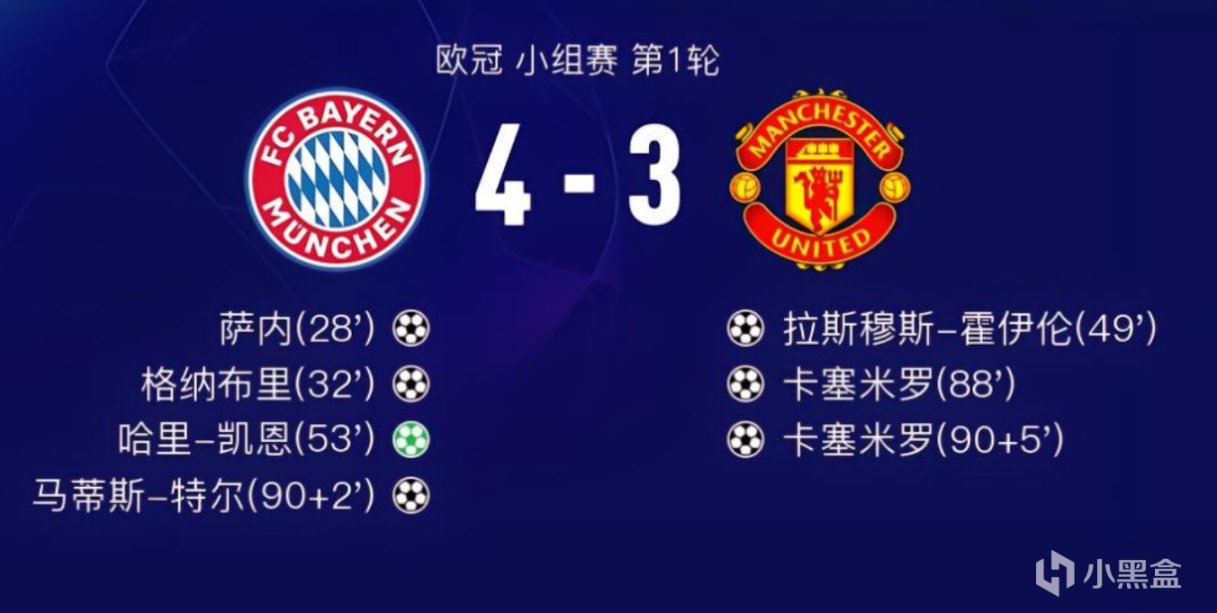 9月21日,欧冠小组赛首轮焦点战,拜仁对阵曼联!上半场,凯恩与萨内撞墙配合,奥纳纳扑救失误,拜仁 取得领先,随后格纳布里无人盯防情况下破门得手,拜仁半场2-0领先!下半场,霍伊伦禁区内打门,球经金玟哉折射入网,曼联追回一球,随后于帕造点凯恩主罚一蹴而就,拜仁3-1曼联!比赛末段,卡塞米罗卧射破门,随后接B费任意球头球梅开二度,特尔替补打入一球,最终拜仁 4-3 战胜曼联!