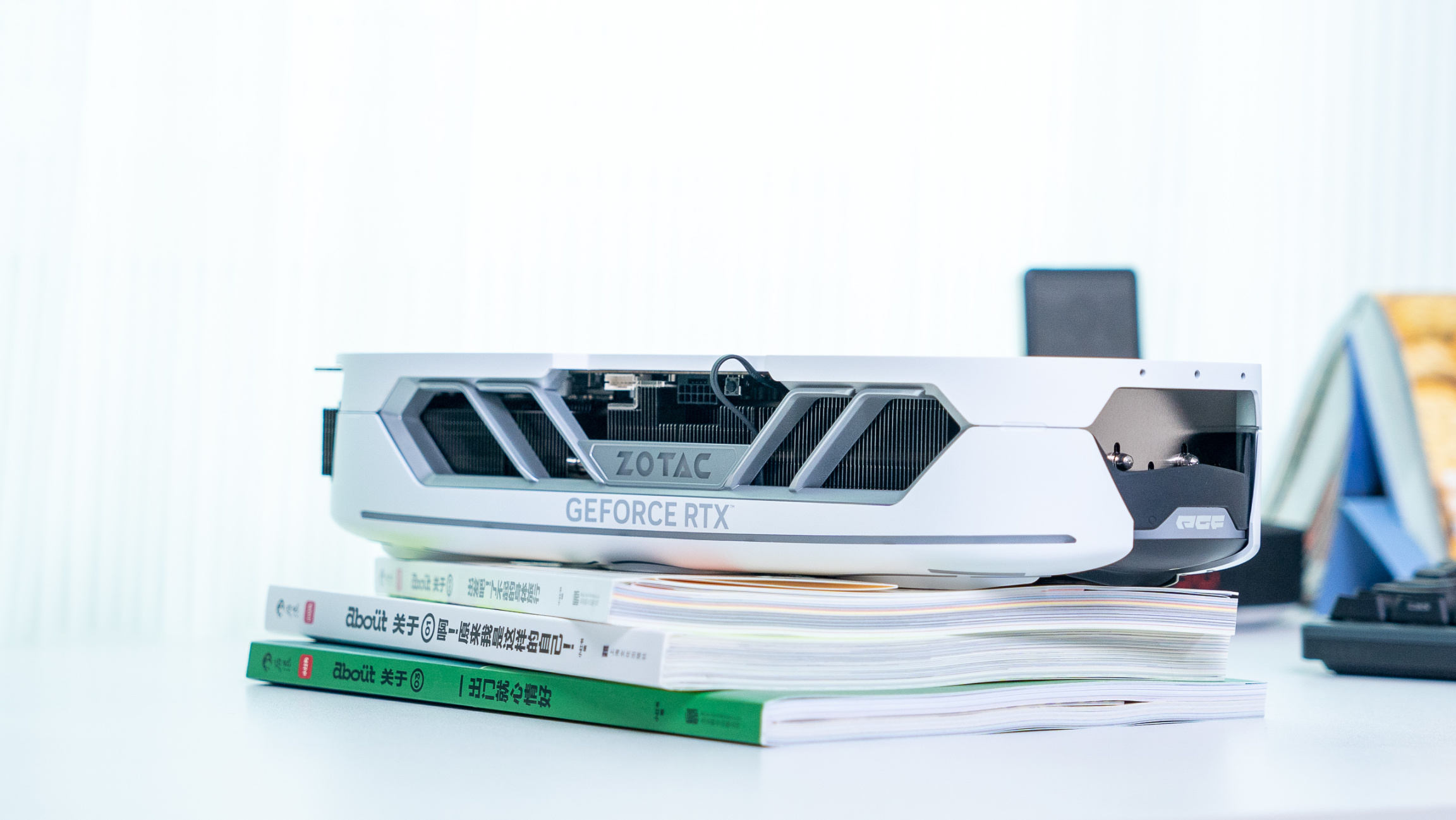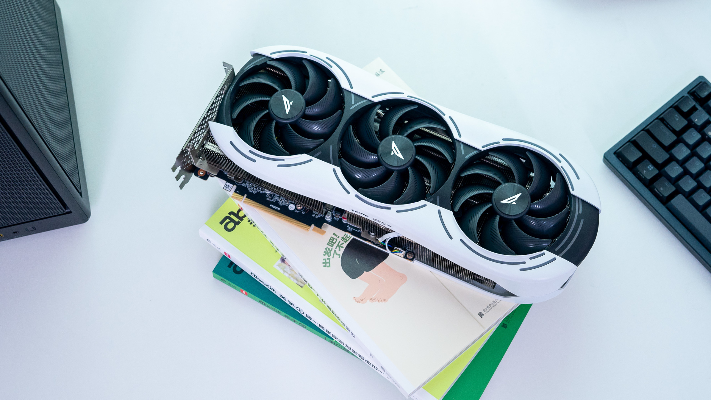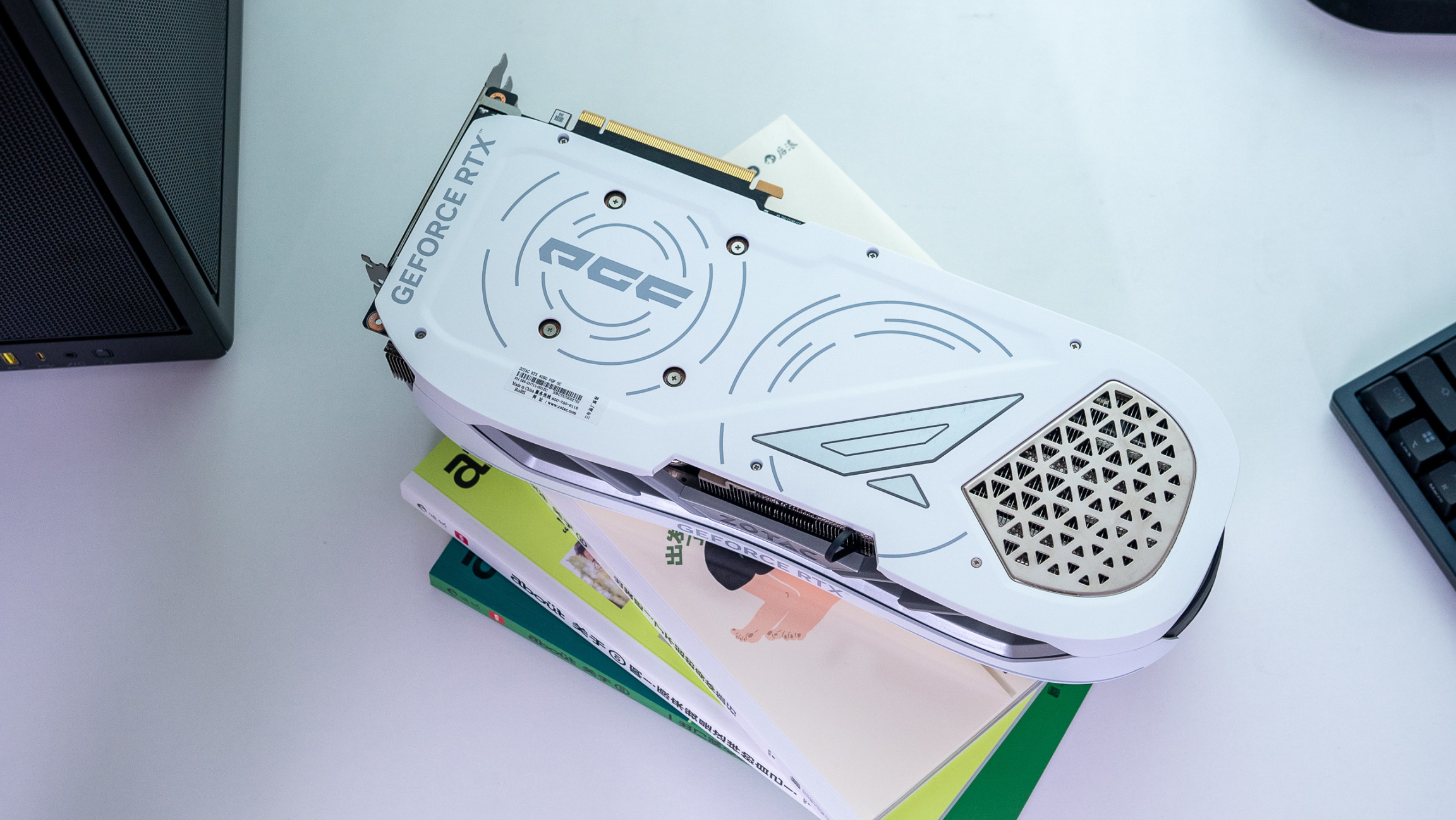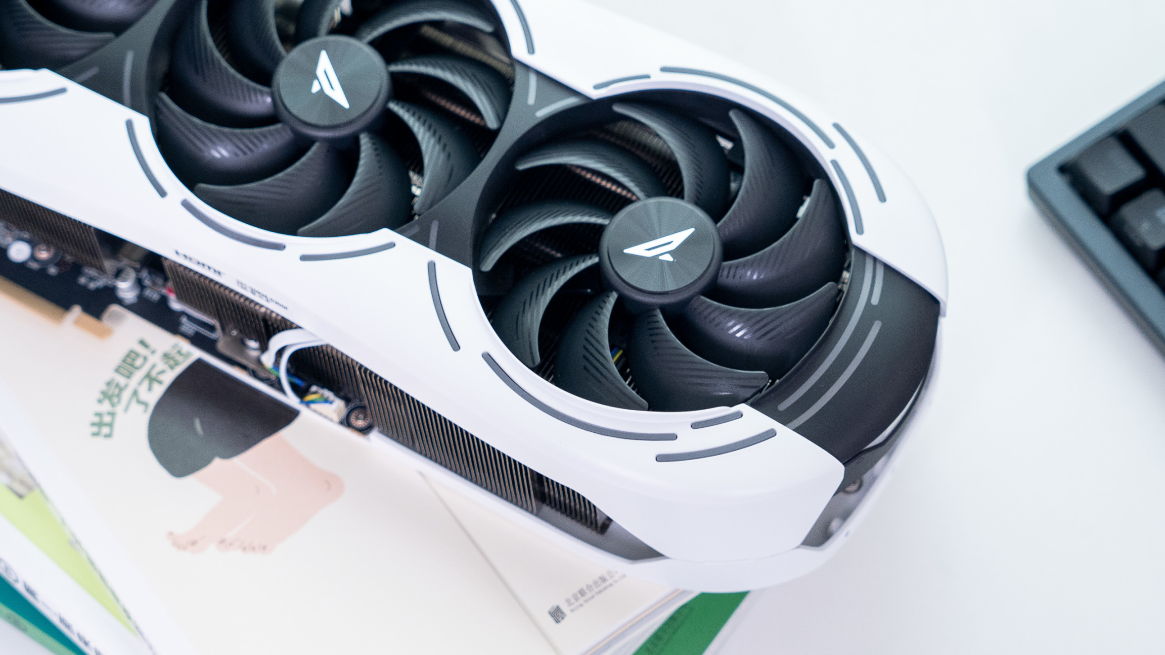 外观方面,我很难说相比AIRO 月白还是这张索泰 RTX 4090 PGF OC 那张更好看,两张卡都用了更多圆曲设计,但是似乎PGF OC 更「方正」一些?黑白配色的风扇与外壳,以及风扇一周的圆曲灯带设计会在装机方案上给我更多惊喜。