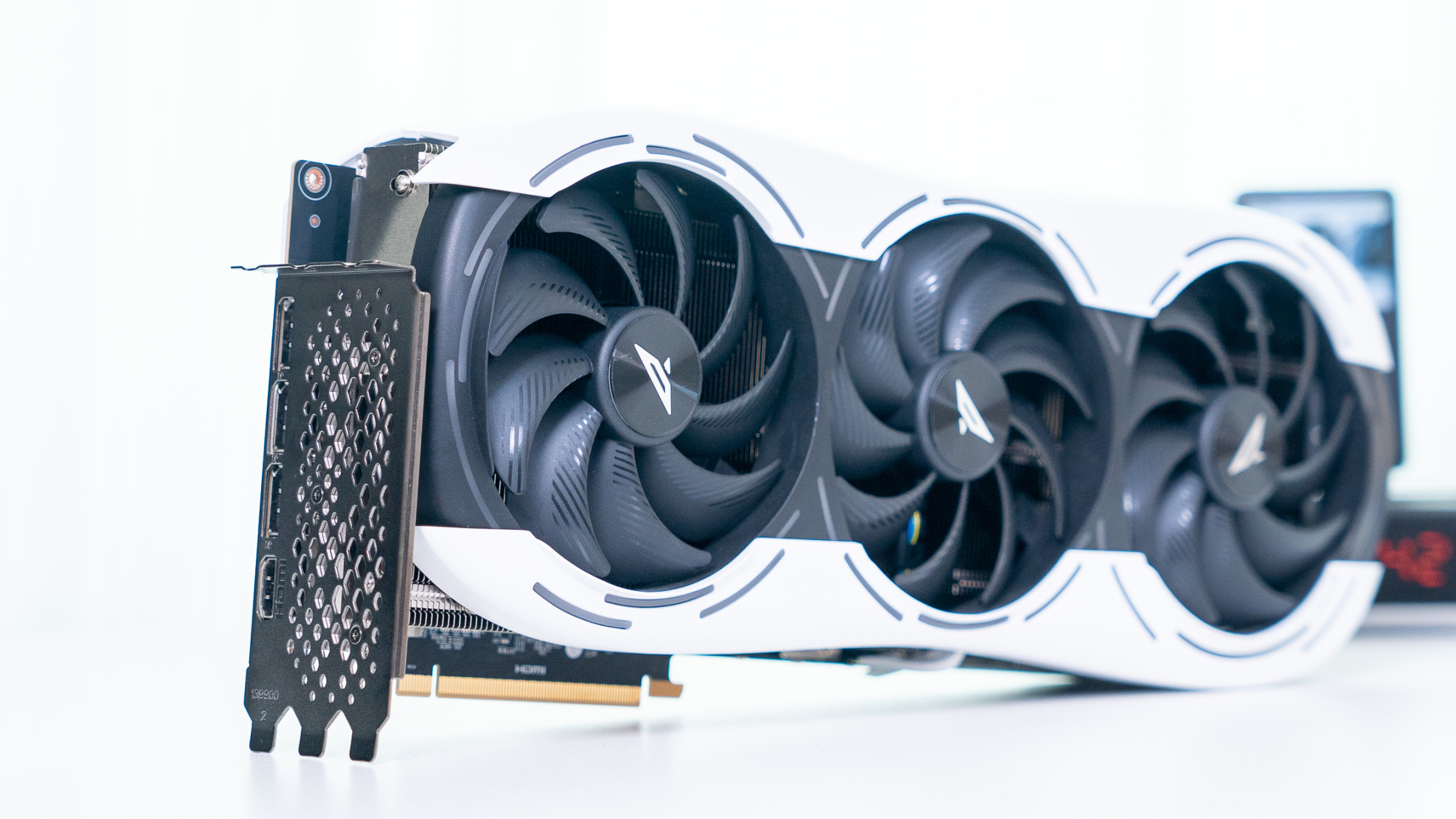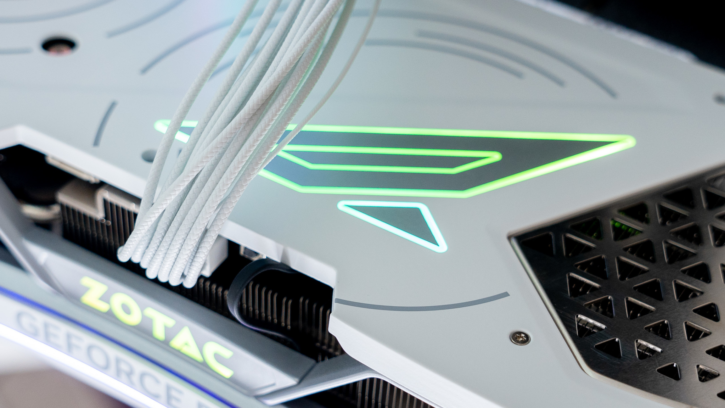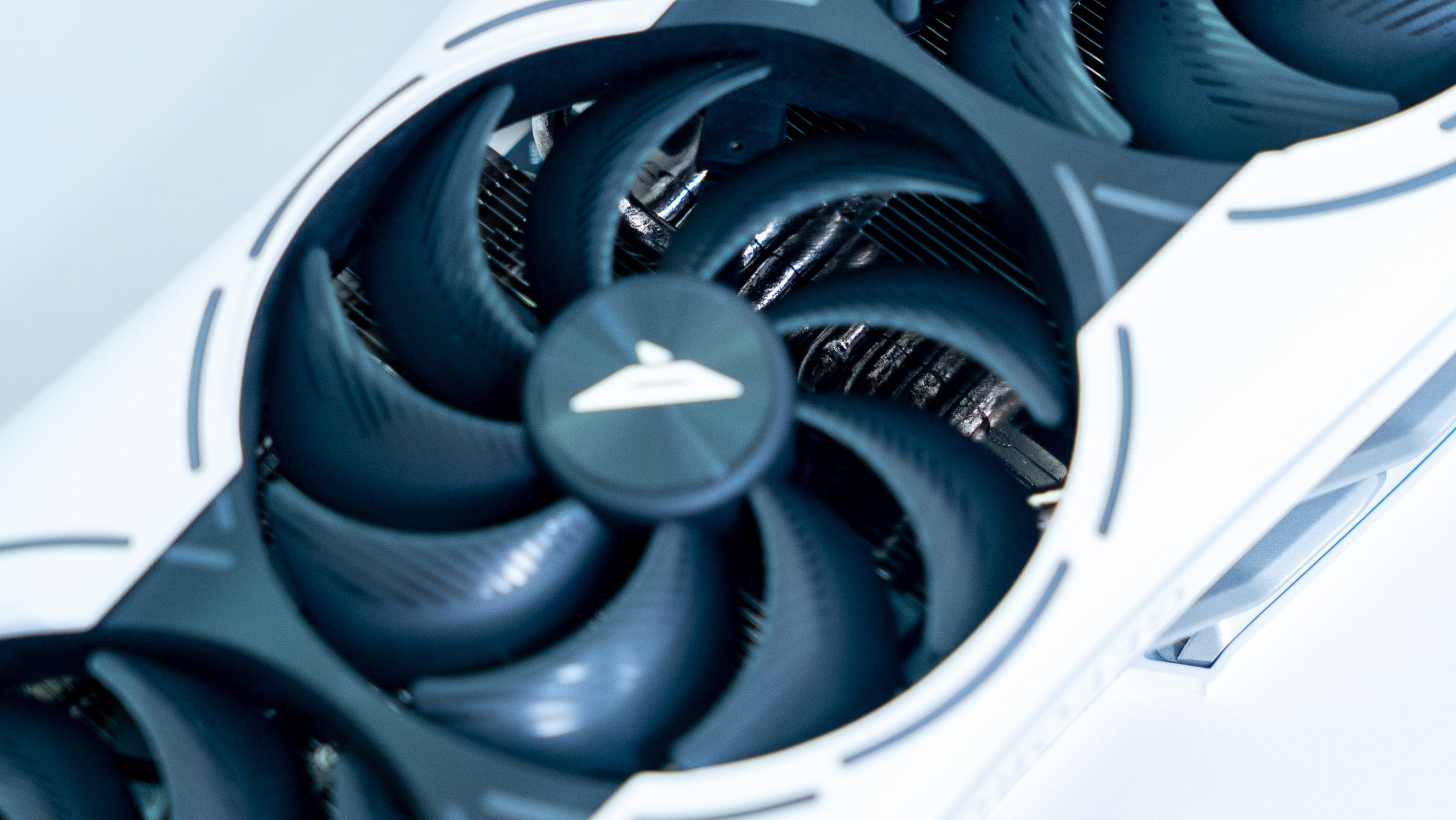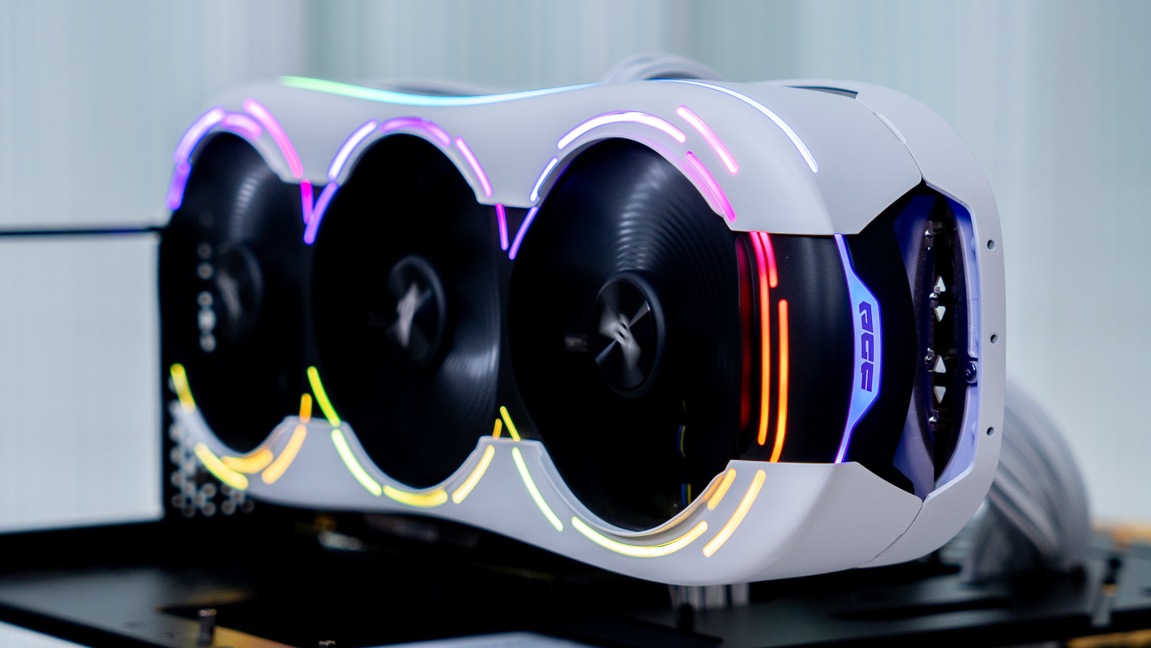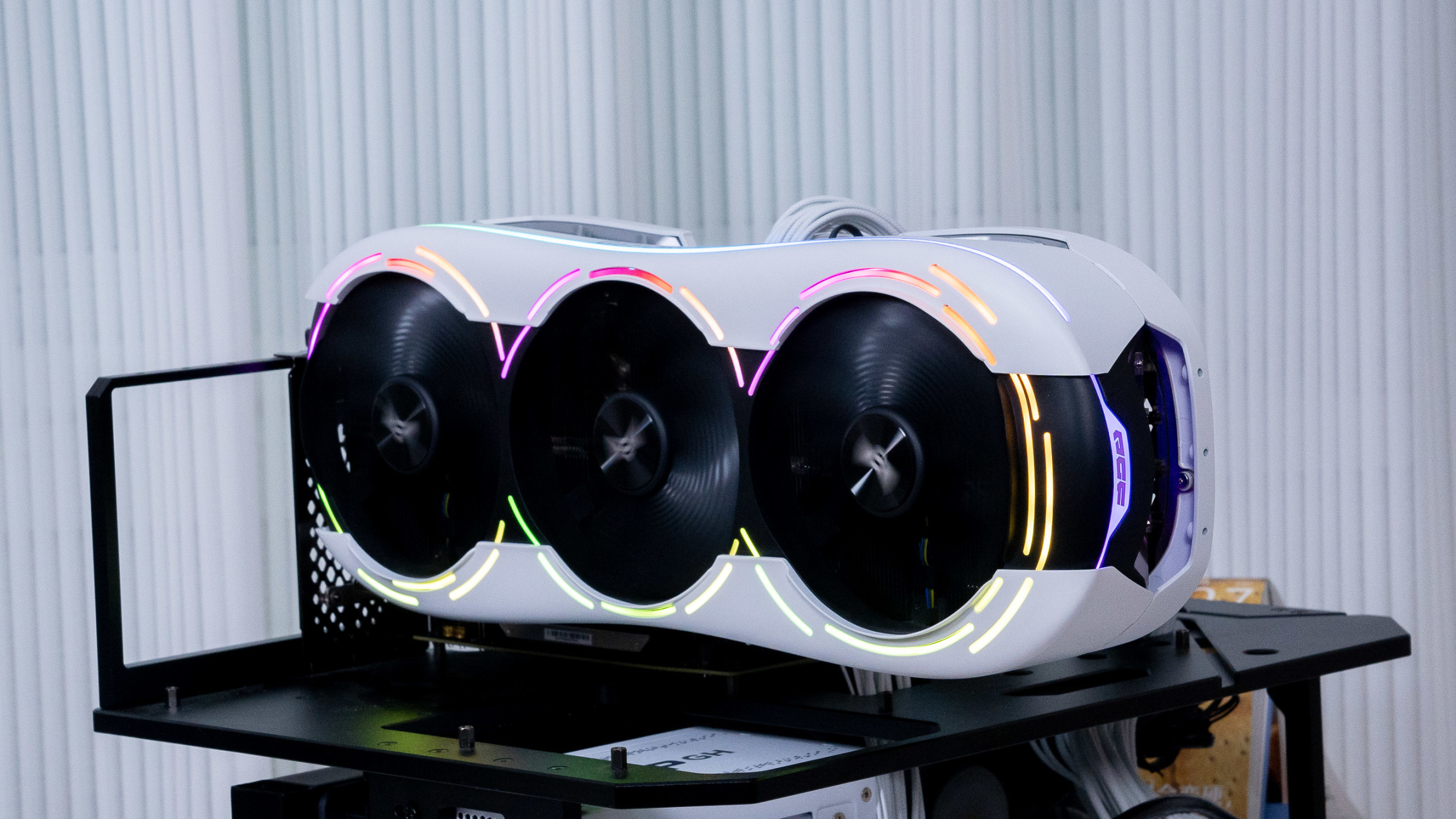 外观方面,我很难说相比AIRO 月白还是这张索泰 RTX 4090 PGF OC 那张更好看,两张卡都用了更多圆曲设计,但是似乎PGF OC 更「方正」一些?黑白配色的风扇与外壳,以及风扇一周的圆曲灯带设计会在装机方案上给我更多惊喜。