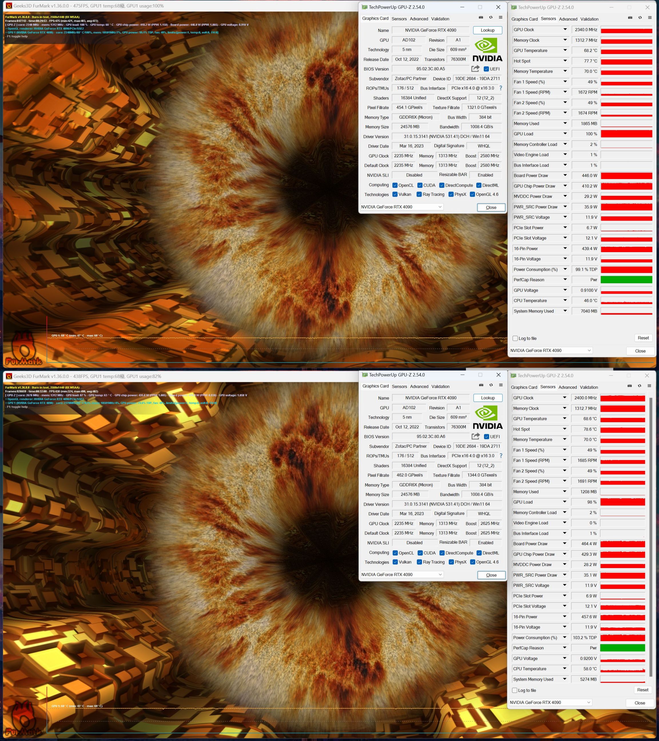 索泰 RTX 4090 PGF OC 显卡在甜甜圈烤鸡测试下,频率 2340/2400MHz,显存频率 1312.7 MHz,显卡核心温度 68.2/68.6 ℃,功耗446/464.4W上下。