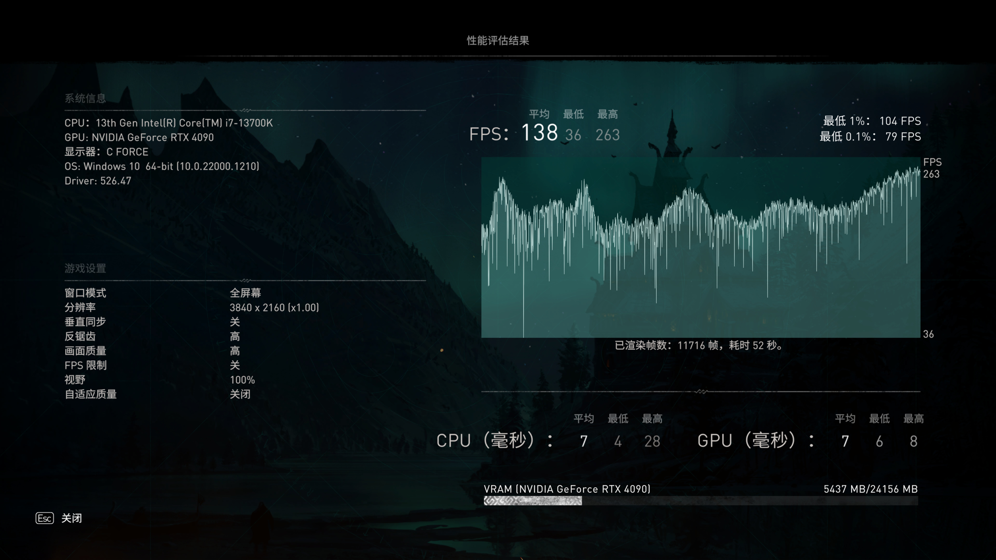 「ASSASSIN’S CREED VALHALLA」游戏内benchmark测试4K 画质平均帧数138帧 ,最低帧数79帧;